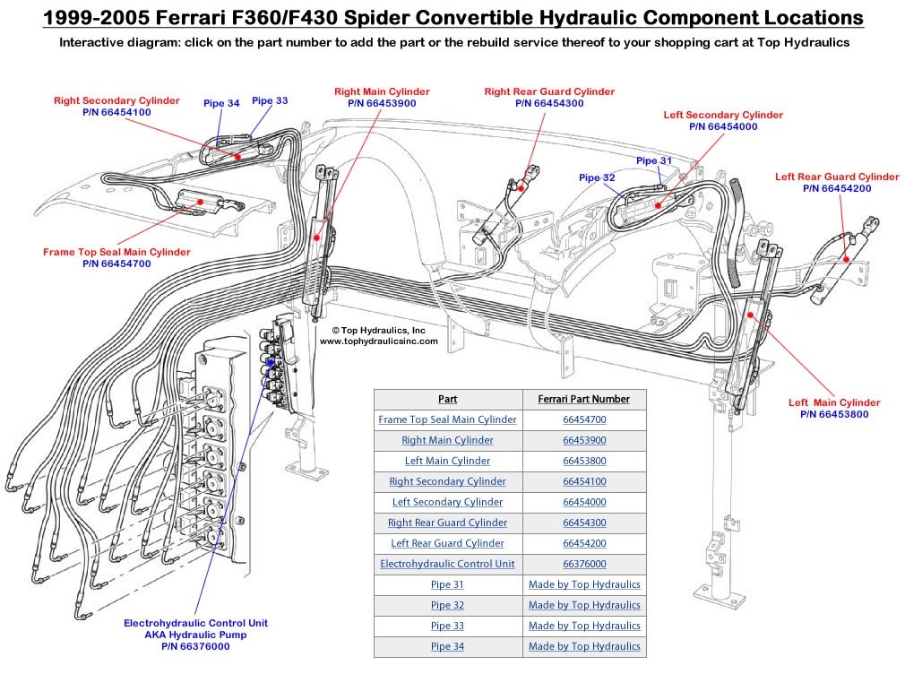 Model year '99-'05 F360's have seven hydraulic cylinders for soft top actuation and latching. Top Hydraulics upgrades the internal seals with far superior material, making your cylinders better than brand new ones.