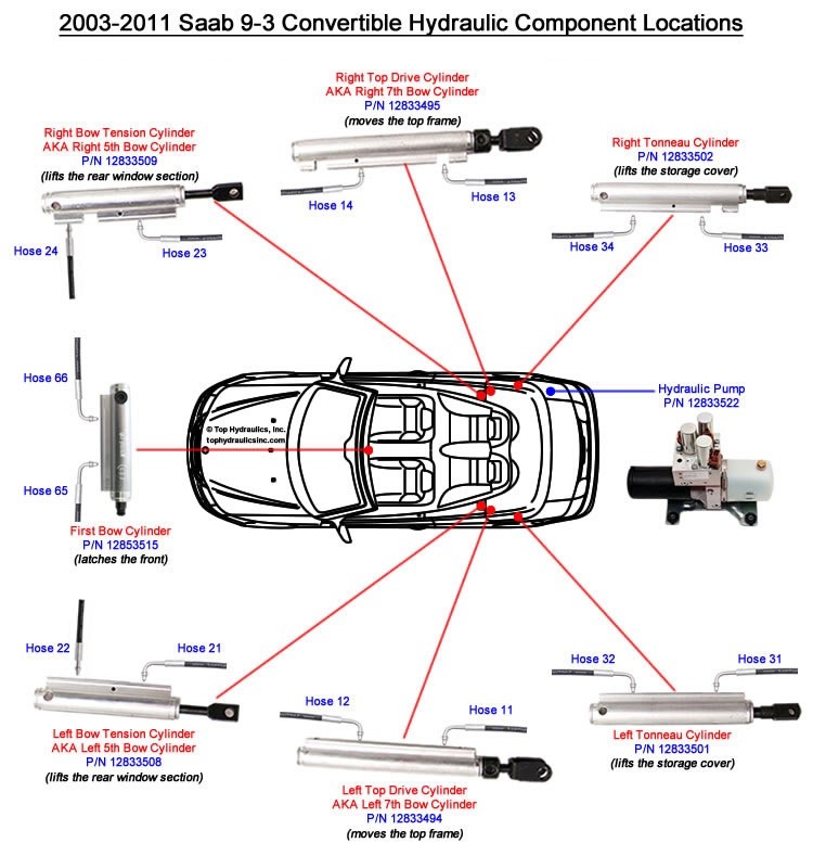 Model years 2003 and up have seven cylinders that actuate the soft top and its latches. All cylinders are very similar to each other, and it is hard to tell which one will fail first. The decay rate is generally a function of temperature. The biodegradable seals inside make eventual failure of all rams almost certain, unless the car gets wrecked prematurely.
